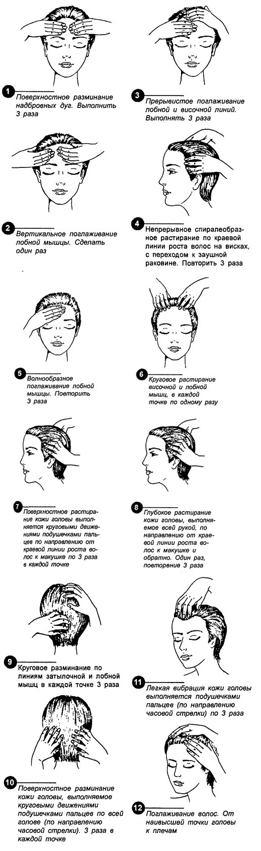 Самый распространенный массаж для роста волос выглядит так. Процедура отнимает 12-15 минут.