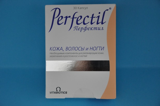 - Перфектил. В основном содержит витамины А, Е, железо, цинк в виде экстрактов эхинацеи, корневищ лопуха. Стимулирует обмен веществ, их циркуляцию в клетках, питание фолликул. Также это эффективный антиоксидант.