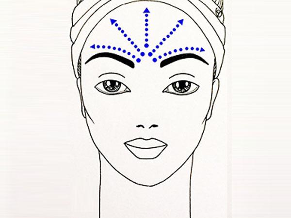 Обработав нос, переходят ко лбу. Работают от переносицы. Воздействию подлежат боковые поверхности от центра, двигаются к вискам. Аналогично прорабатывают полную поверхность зоны. Массажные линии находятся в направлении от переносицы, начало ориентировано на центр лба. Помимо дугообразной проработки, совершают вертикальные движения, направленные от поверхности бровей к росту волос.