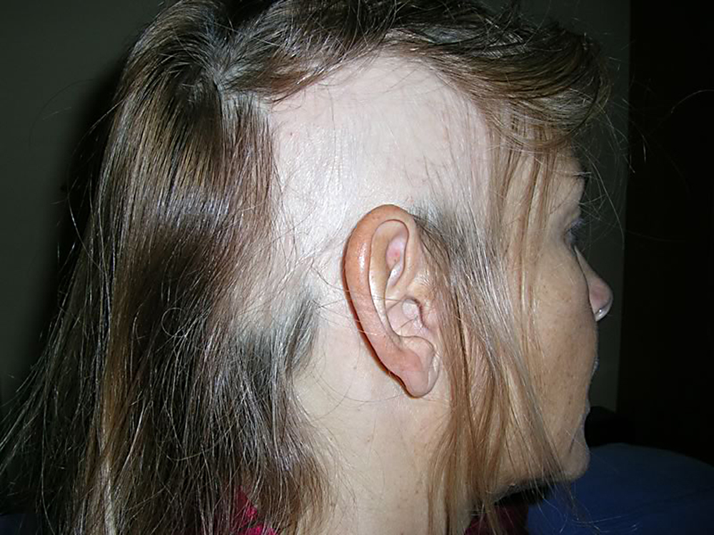 - У женщин пряди становятся реже на проборе, истончаются в области лба. Возможно и облысение по мужскому типу, когда поражаются лобная, височная, затылочная часть.